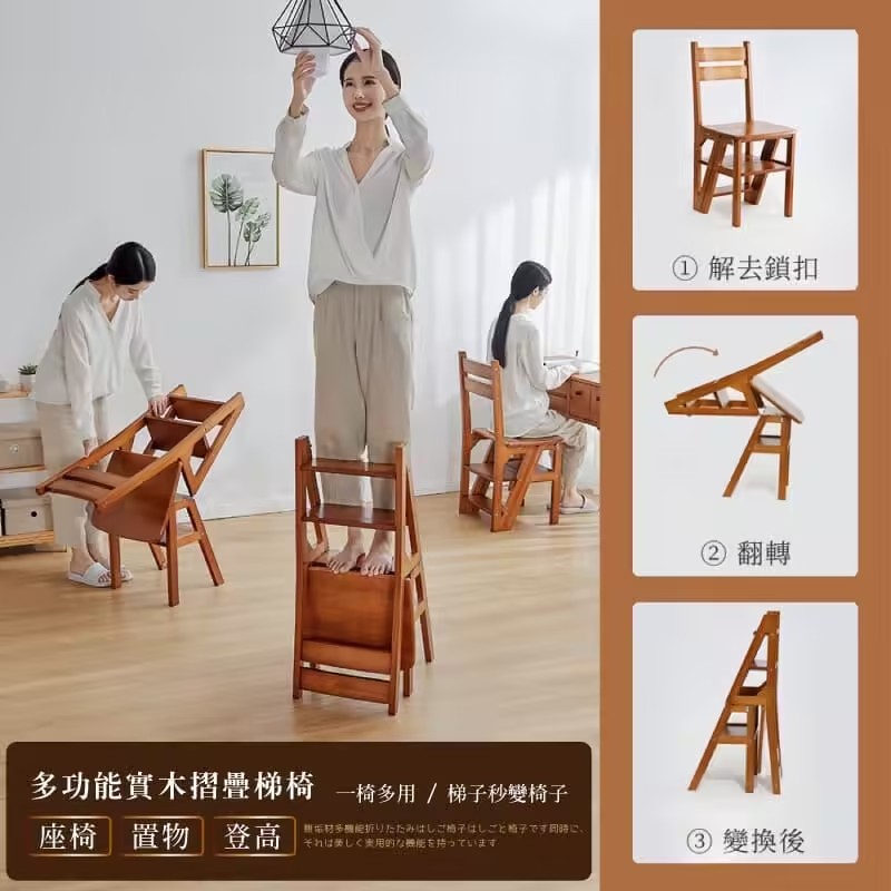4分鐘前【現貨】二合一折疊梯子椅,木料製作,打磨精緻,可變為簡易小梯子,可幫助拿取高處物品 - 【三層|純實木|翻转收纳】NT$2580